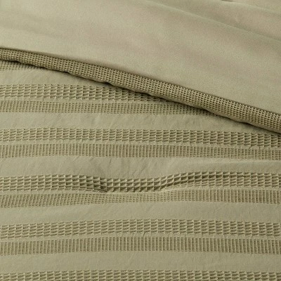 The Westmont Waffle Stripe Comforter Bedding Set from Threshold™ will give your bed a soft surface texture and pattern. The solid-hued comforter is adorned with waffle stripes for a stunning aesthetic that will complement any bedroom decor. The set includes a square and a rectangular decorative pillow with waffle or channel-stitch stripes, as well as a matching pillow sham, to coordinate on the top of the bed for a cohesive look. This comforter bedding set features a year-round fabric construction for comfortable use. Pair it with white bedsheets to enhance the sophisticated and clean look.