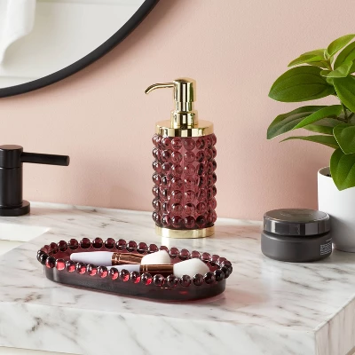 Enhance the aesthetics and functionality of your bathroom or dresser with this Textured Glass Tray from Threshold™. Made of glass, this oblong tray features a beaded design over the rim that elevates the visual appearance of your bath. Designed in a mulberry hue, this glass tray is ideal for keeping makeup brushes, skin creams, lip balms, and other essentials.