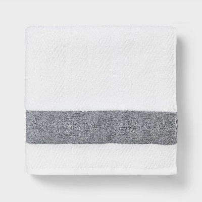 Amp up your bathroom decor with this Traditional Crinkle Border Towel from Threshold™. Made from 100% terry cotton, this decorative bath towel feels soft and allows you to dry off quickly. Designed in a white hue, this bath towel features a crinkled border in gray for elegant contrast. Machine washable for easy cleaning, it also features a top loop for easy hanging from a hook in your bathroom.