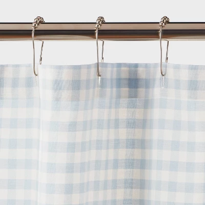 Elevate the look of your bathroom with this Traditional Gingham Plaid Shower Curtain from Threshold™. This decorative shower curtain features a gingham check print in white and blue with a contrasting rust and blue border for classic style. Made from cotton-recycled polyester blend fabric, this printed shower curtain features a buttonhole top for quick installation, while the machine-washable design allows for easy cleaning when needed.